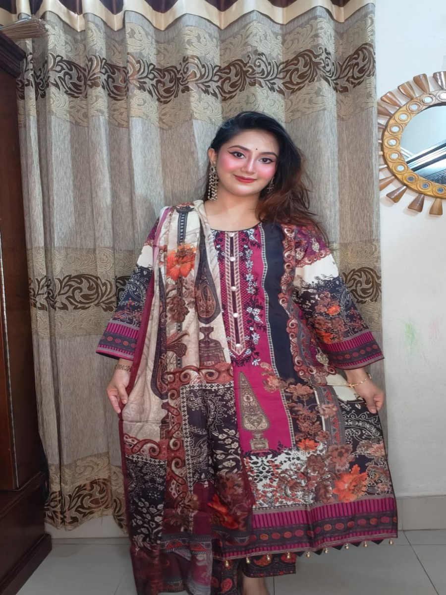 premium ac cotton fabric, readymade 3 piece, full body and orna printed  100% color guaranteed.